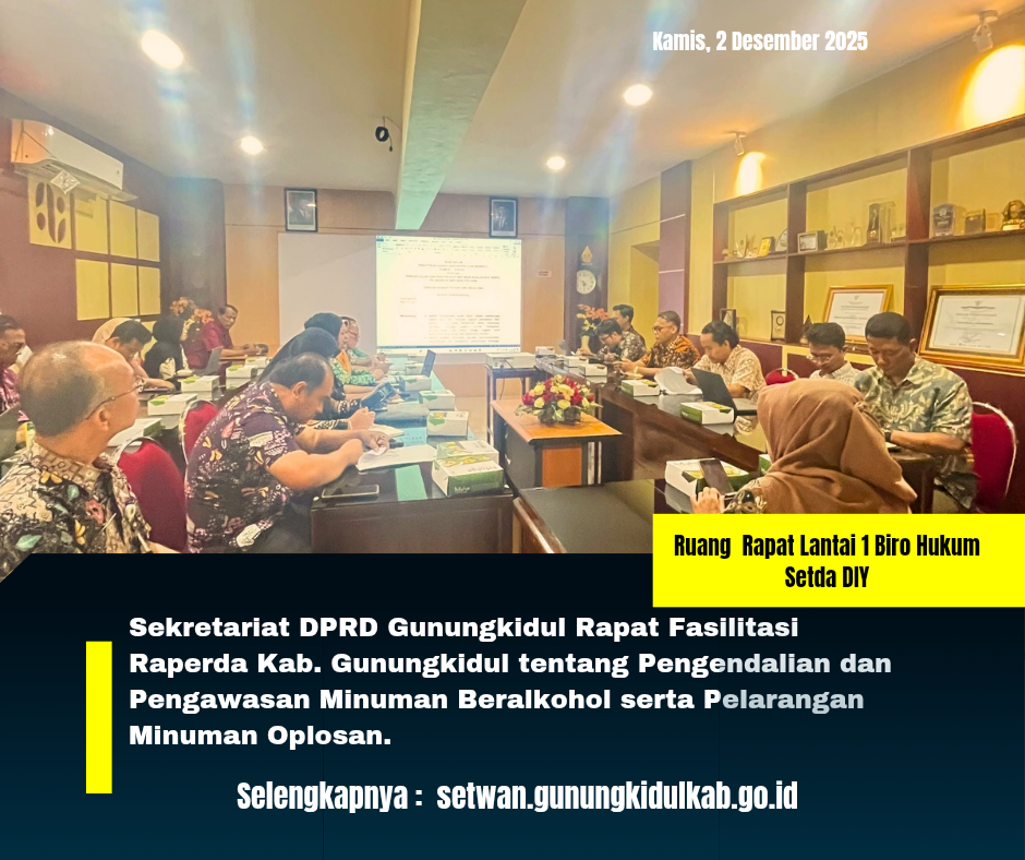Sekretariat DPRD Gunungkidul menghadiri Rapat Fasilitasi Rancangan Peraturan Daerah (Raperda) Kabupaten Gunungkidul tentang Pengendalian dan Pengawasan Minuman Beralkohol serta Pelarangan....